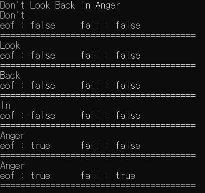 Anger를 읽을 때의 flag상태를 보자 Anger를 처음 읽은 후, eof가 true상태가 되고, 한 번 더 읽은 후에야 fail이 true로 전환되는 모습을 볼 수 있다.