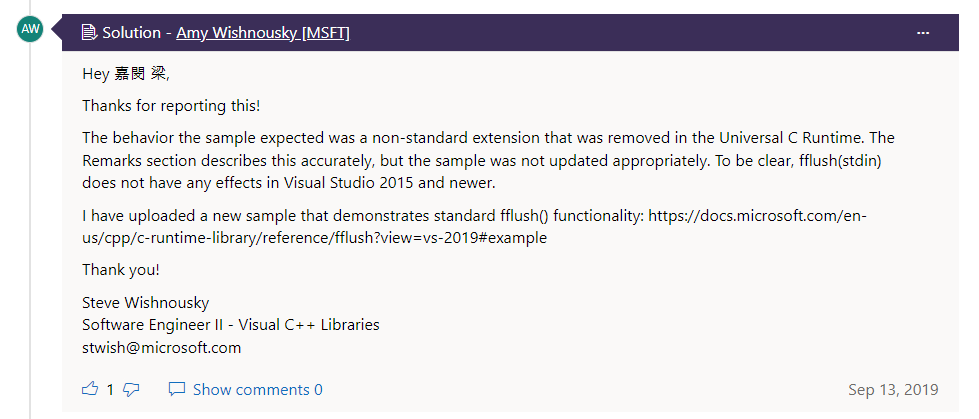 이유를 찾아보니 fflush함수는 Visual Studio 2015버전 이후부터는 정상적으로 작동하지 않는다는 글을 발견했다.